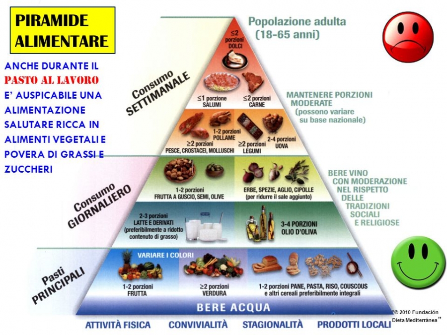 Sui gradini della piramide sono distribuiti in ordine decrescente di quantità, dal basso verso l’alto, i 5 gruppi di alimenti, a partire dalla frutta e dagli ortaggi, di cui vanno assunte circa 5 porzioni al giorno, fino agli zuccheri e ai grassi che vanno utilizzati con estrema moderazione.